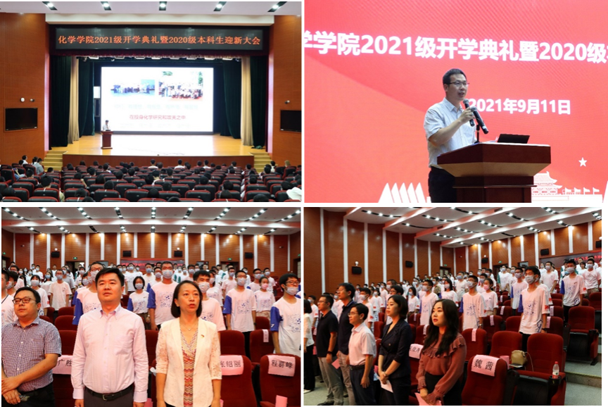 全体齐唱雄壮的国歌过后,太阳成集团官方网站院长刘明杰致辞。刘明杰开篇先谈到了化学学科的重要性和实用性,接着向同学们介绍了太阳成集团官方网站的概况。从基础学科研究的重要性,到解决我国众多卡脖子领域关键问题的需要,到将个人发展与国家需求相契合,嘱咐同学们学习化学,生逢其时,重任在肩。最后寄语新生:志存高远,敢为人先;独立思考,勇于创新;精勤求学,久久为功。