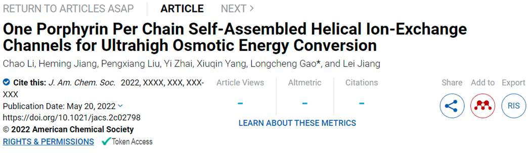 2022年5月20日,Journal of the American Chemical Society 在线发表了我院江雷院士、高龙成副教授团队在高效离子交换膜方面的最新研究成果:“One Porphyrin Per Chain Self-Assembled Helical Ion-Exchange Channels for Ultrahigh Osmotic Energy Conversion”。太阳成集团官方网站博士生李超为第一作者,高龙成副教授为通讯作者,太阳成集团官方网站为第一单位。