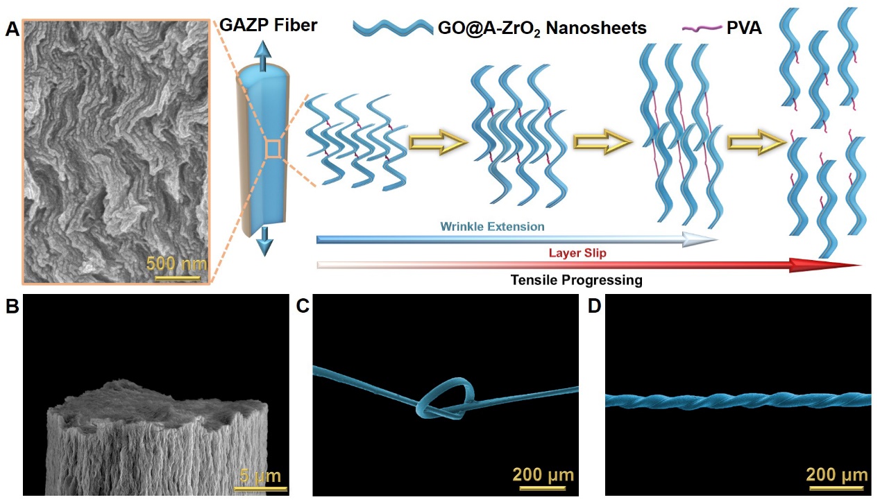 原位力学性能测试表明:不同于传统氧化石墨烯纤维在拉伸过程中出现的“片层拔出”机制,晶体-非晶双相超结构纤维同时还存在“褶皱展开”机制。在两种机制的协同下,纤维的断裂韧性得到了显著提升,进而使得纤维具有优异的结构灵活性,可以容易地混编成粗线或复合材料。在航空航天、机械工程和纺织工程等方面具有巨大的应用潜力。