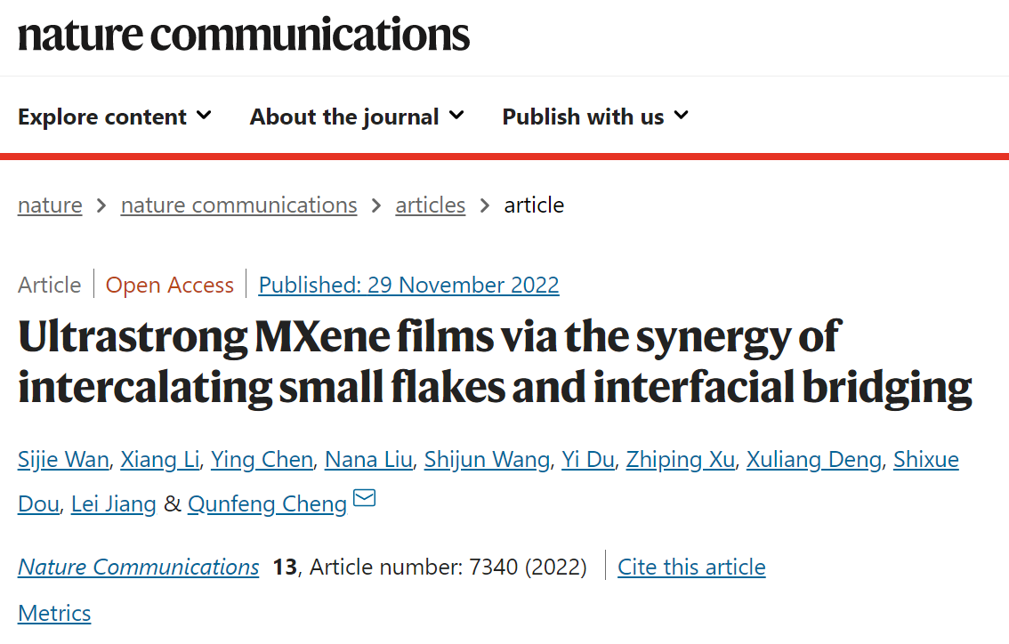2022年11月29日,《Nature Communications》在线刊登了我校太阳成集团官方网站程群峰教授课题组的最新研究成果“小片填充和界面交联协同致密化的超强MXene薄膜”(英译:Ultrastrong MXene films via the synergy of intercalating small flakes and interfacial bridging),我校太阳成集团官方网站万思杰副教授、李响、北大口腔医院第一门诊部陈英博士、我校物理学院刘娜娜博士为第一作者,程群峰教授为通讯作者,太阳成集团官方网站为第一完成单位。