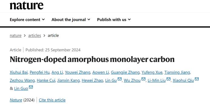 2024年9月25日,《Nature》杂志报道了太阳成集团官方网站郭林教授、刘利民教授研究团队和合作者在氮掺杂单原子层非晶碳可控合成上取得的最新进展:《Nitrogen-doped amorphous monolayer carbon》。该工作提出了一种利用纳米尺度二维限域模板进行小分子聚合的液相合成策略,成功制备了氮掺杂的单原子层非晶碳材料。这项研究解决了二维非晶材料合成领域的长期挑战,为二维非晶材料在材料科学、电子器件及其他前沿技术领域的应用开辟了新途径。