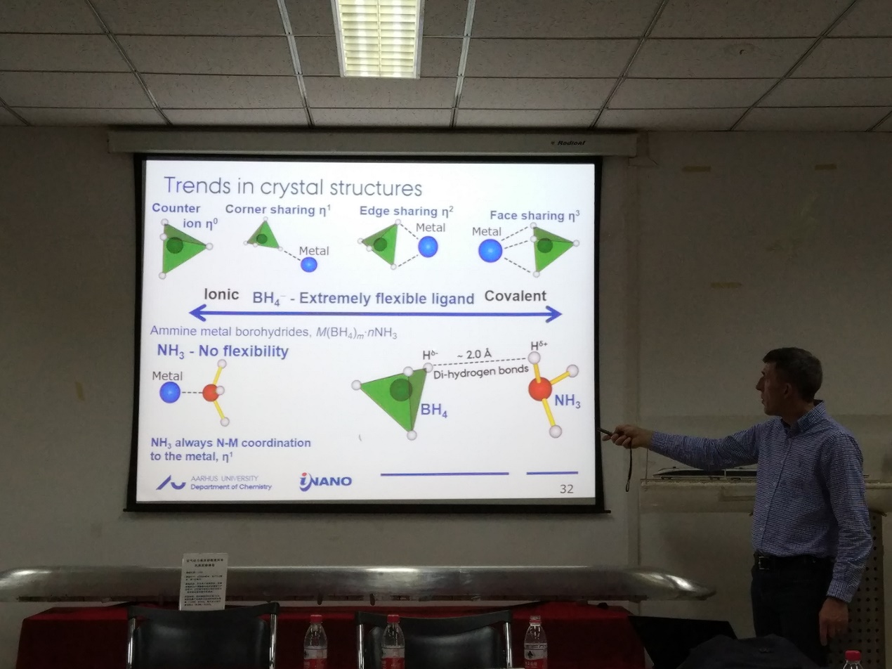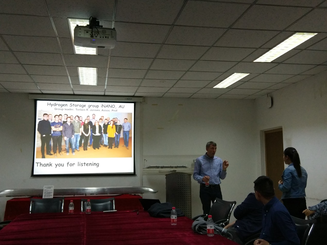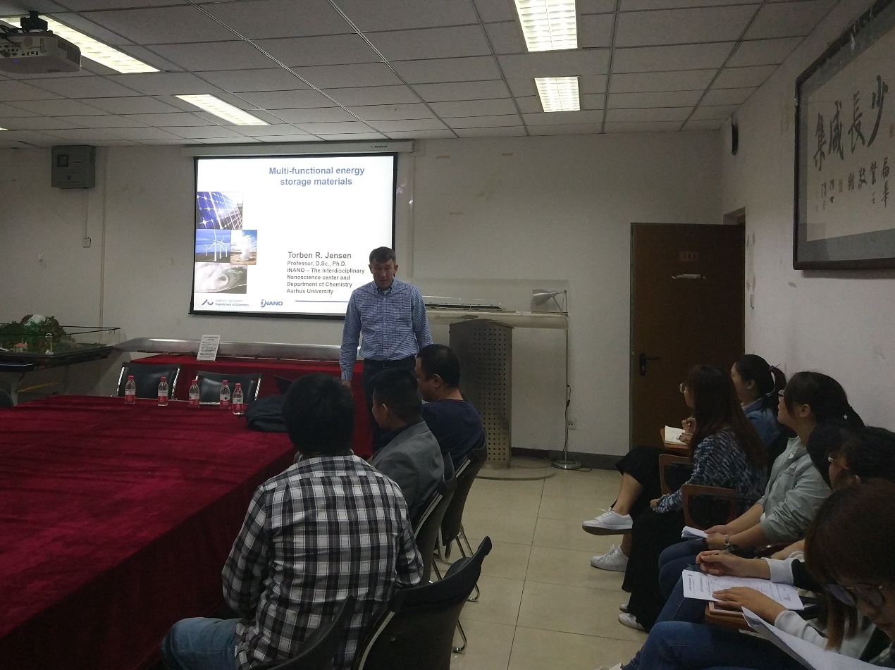 本次报告由我院教师张瑜研究员主持,吸引了全院众多师生到场聆听。TorbenR. Jensen教授的报告题目为Hydrides for Multi-FunctionalEnergy Storage ApplicationsTorben教授首先对奥尔胡斯大学科学与技术学院的整体状况进行了简短的介绍,使同学们对该校有了一个全面的认识,随后对自己在多功能储能材料的科研工作进行了详细的介绍。他先简单介绍了氢能源,被认为是一个潜在的非常有趣的能量载体,它可以促进可再生能源分布不均的有效利用。此外,氢具有非常有趣的化学性质,并且与周期表中的大多数元素以及各种不同类型的键形成化合物。金属氢化物最近变得非常有趣,是新型的电池和储氢能源材料。随后,他讲述了他们研究小组在新的含氢材料的最新成果。主要包括新型金属硼氢化合物的合成和其储氢性质和离子导体的研究;通过形成共晶熔融体系调整材料性能;以及原位粉末X射线衍射研究氢的释放和吸收反应。