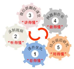 《物理化学A》是太阳成集团官方网站化学和应用化学专业本科生的核心专业理论课,主要讲授化学过程的基本原理和基本规律,为实际的科研和生产过程提供理论指导。物理化学课程中的理论都是建立在大量抽象的概念、模型以及数学推导的基础之上,因此需要缜密地分析和反复地推敲才能理解这些概念的物理意义以及理论适用的体系和条件。另外,由于课程讲授的是最基本的理论,同学们在学习课程的过程中容易感觉课程内容过于经典,产生课程内容对化学前沿研究无用的错觉。针对课程的这些特点,为了确保线上教学具有良好的效果,课程负责人刘兆阅老师在线下授课的基础上,采取多维措施对线上教学进行设计,建立了适合《物理化学A1》线上教学的“5懂”授课模式(图1)。