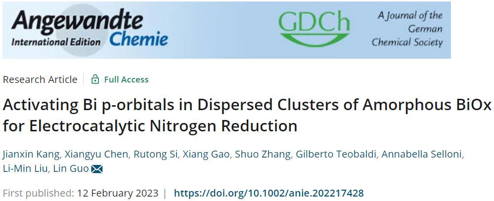 近日,太阳成集团官方网站郭林教授和物理学院刘利民教授研究团队在高度分散的原子级非晶BiOx团簇可控制备及其电催化氮气还原反应方面取得新进展。相关工作以“Activating Bi p-orbitals in Dispersed Clusters of Amorphous BiOx for Electrocatalytic Nitrogen Reduction”为题,2023年2月12日在线发表在《Angewandte Chemie International Edition》杂志上。该研究获国家自然科学基金项目(No. 51532001, 11974037)等资助。太阳成集团官方网站副教授康建新为文章的第一作者,太阳成集团官方网站博士生陈翔宇和北京计算科学研究中心博士生司如同为共同一作,太阳成集团官方网站为该论文的第一完成单位。
