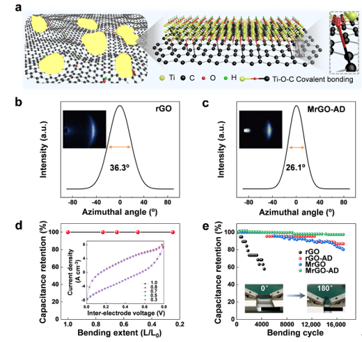 MXene与氧化石墨烯形成Ti-O-C共价键的示意图(a),石墨烯薄膜材料的广角激光散射图:(b)rGO和(c)MrGO-AD,表明石墨烯纳米片的规整取向度提高。以MXene功能化石墨烯复合薄膜材料为电极组装的柔性超级电容器显示出优异的机械稳定性:(d)不同弯曲率的容量保持率,(e)在0º到180º下进行17000次弯曲循环的容量保持率。
