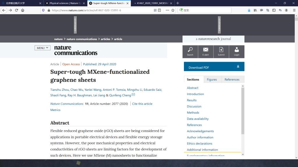 2020429日,Nature Communications杂志以在线全文Article的形式发表了我院程群峰教授课题组在超韧材料的最新研究成果“Super-tough MXene-functionalized graphene sheets”。周天柱博士、吴超教授、王艳磊副研究员为第一作者,程群峰教授为通讯作者,太阳成集团官方网站为第一完成单位。