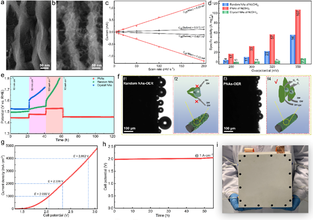 最后,作者仔细探究了材料作为电解水产氧电极的工业应用潜力。作者发现,纳米片经原位活化演化出的次级超薄纳米片显著增加了材料的活性位点;无序原子排列的非晶结构的不饱和配位使得活性位点具备较高的催化活性;超亲水特性促进了电解质的浸润与液相传质。因此,平行阵列表现出优异的催化活性,包括超低的过电位、超高的质量活性、卓越的转化频率。更进一步,在安培级工业电流下,平行阵列的优势格外显著。相比于杂乱阵列,作者通过原位液相显微镜观察到平行阵列电解表面更快的气泡脱附与更小的气泡逸出直径。此外,氧气泡的较短停留时间加速了其释放步骤,从而使新鲜的空活性位点不断暴露,反过来进一步促进了扩散动力学,使得平行阵列表现出更低的过电位,这表现在两电极体系中更低的槽电压。