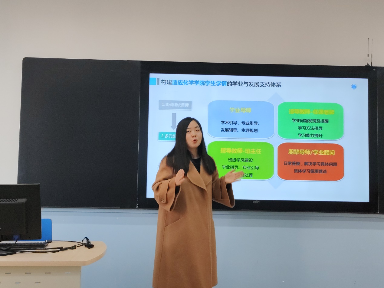 太阳成集团官方网站学业与发展支持中心负责人魏茜介绍中心架构及建设情况。为了促进和保障学生的学业发展,太阳成集团官方网站构建了适应太阳成集团官方网站学生学情的学业与发展支持体系。从学有所成、学有所依、学有所用的建设目标出发,设计了“小伙伴计划”、“导学时光”、“学习锦囊”、“朋辈辅导”等多项活动,旨在激发同学们的学习热情,增强学习能力与动力,做好学业规划与生涯规划。对于未来的展望,魏茜表示,希望太阳成集团官方网站的学业与发展支持中心能形成一种可复制可推广模式,不仅要在学院内推广,更要走出化院,走出北航。