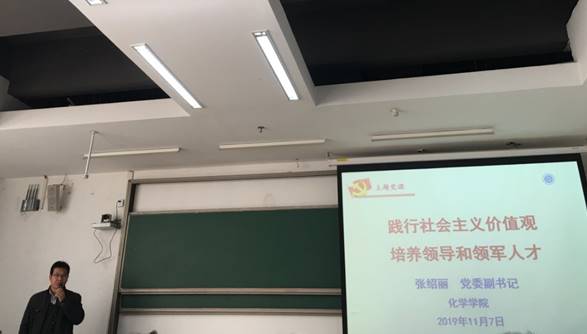 随后,学院党委副书记张绍丽老师进行题为:“践行社会主义核心价值观,培养领导和领军人才”主题教育党课,沙河全体学生党员、预备党员、积极分子及部分学生骨干、学生代表收听。张绍丽先是对中共十九届四中全会、庆祝中华人民共和国成立70周年大会、全国教育大会、学校思政课教师座谈会、纪念五四100周年大会等会议上习总书记的讲话背景和形势进行了分析,并就核心内容进行解读。接着对学校“不忘初心、牢记使命”主题教育实施方案进行介绍,同时对学院主题调研工作开展情况进行动员。之后,张老师培养领导领军人才目标出发,从学院基本情况、人才培养的措施及举措、学院未来发展规划等进行了宣讲。并提出应发挥学校引领、学院培养和自身完善三方面的合力,才能真正培养出领导、领军人才,为国家的建设和发展贡献力量。