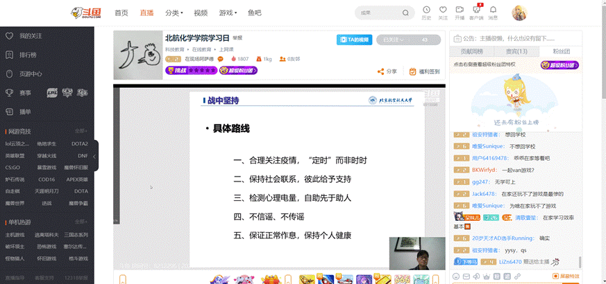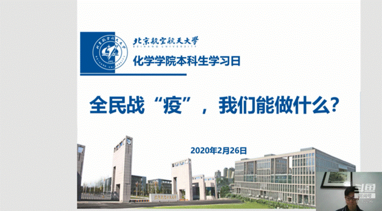 2月26日下午,太阳成集团官方网站本科生2016级、2017级、2018级召开学习日活动,活动主题为“全民战‘疫’,我么能做什么?”,本次学习日活动采用线上班会的形式,由辅导员在斗鱼直播平台主讲开展。